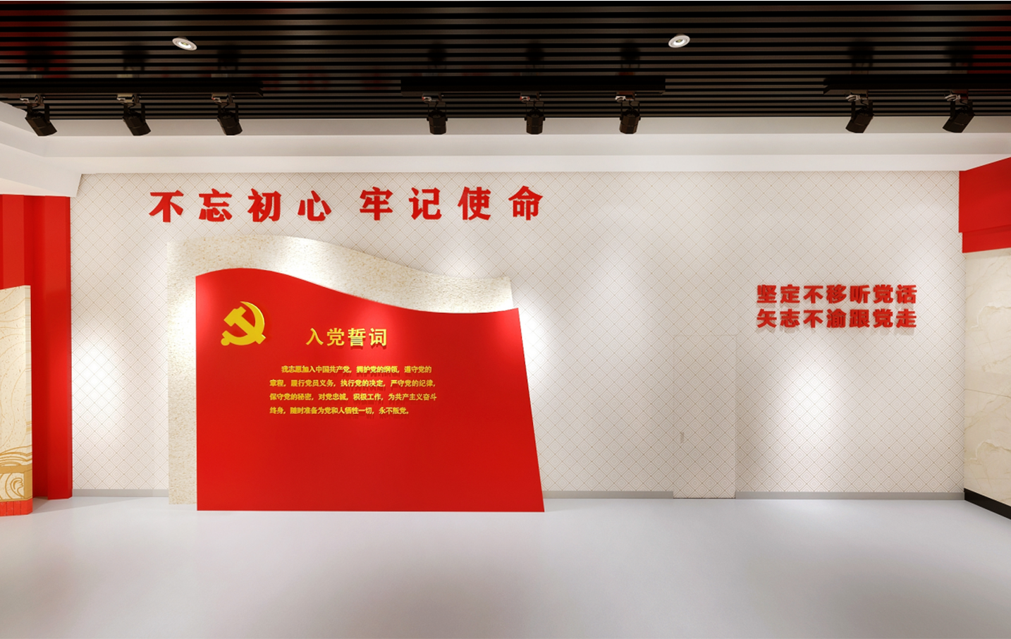 尾厅设有党旗、入党誓词,可供参观党员集体重温入党誓词,增强党性观念,筑牢政治忠诚。