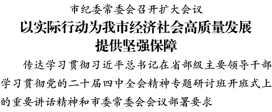 日前,市纪委常委会召开扩大会议,传达学习习近平总书记在省部级主要领导干部学习贯彻党的二十届四中全会精神专题研讨班开班式上的重要讲话精神和市委常委会会议部署要求,研究贯彻落实措施。市委常委、市纪委书记、市监委主任王庭凯主持会议并讲话。