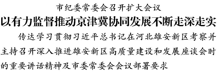 日前,市纪委常委会召开扩大会议,传达学习习近平总书记在河北雄安新区考察并主持召开深入推进雄安新区高质量建设和发展座谈会时的重要讲话精神及市委常委会会议部署要求,研究贯彻落实措施。市委常委、市纪委书记、市监委主任王庭凯主持会议并讲话。