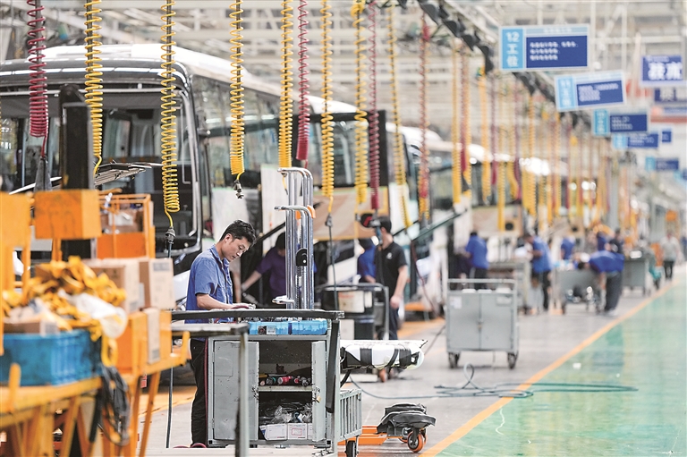 由中国生产出口至阿根廷的纯电动公交车近日在布宜诺斯艾利斯投入运营。图为工人在生产该批电动公交车的扬州亚星客车公司车间内作业。新华社发