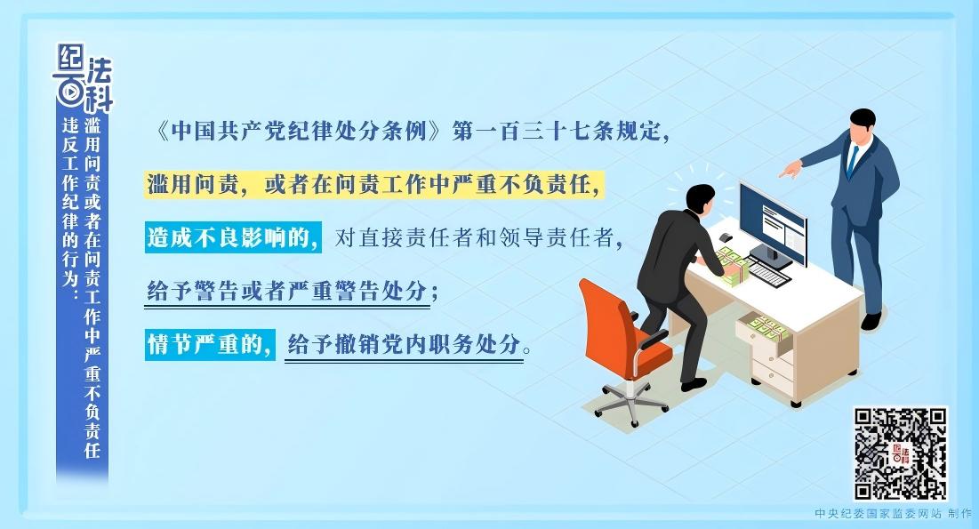 《中国共产党纪律处分条例》第一百三十七条规定,滥用问责,或者在问责工作中严重不负责任,造成不良影响的,对直接责任者和领导责任者,给予警告或者严重警告处分;情节严重的,给予撤销党内职务处分。