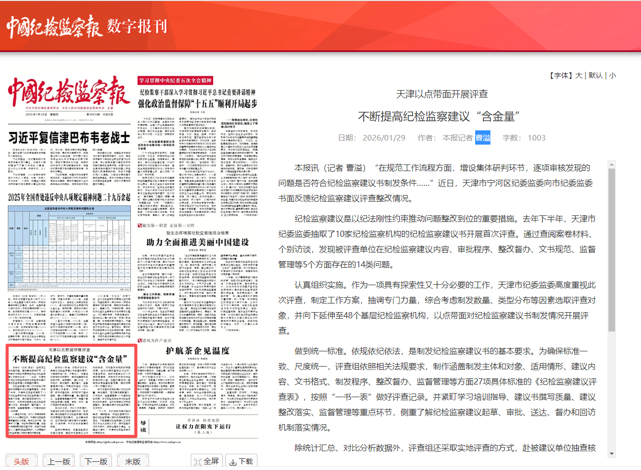 纪检监察建议是以纪法刚性约束推动问题整改到位的重要措施。去年下半年,天津市纪委监委抽取了10家纪检监察机构的纪检监察建议书开展首次评查。通过查阅案卷材料、个别访谈,发现被评查单位在纪检监察建议内容、审批程序、整改督办、文书规范、监督管理等5个方面存在的14类问题。
