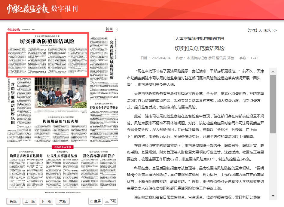 “现在审批环节有了廉洁风险提示,责任清晰,干部履职更规范。”前不久,天津市纪委监委驻市司法局纪检监察组对驻在部门廉洁风险防控措施落实情况开展“回头看”,市司法局相关负责人说。