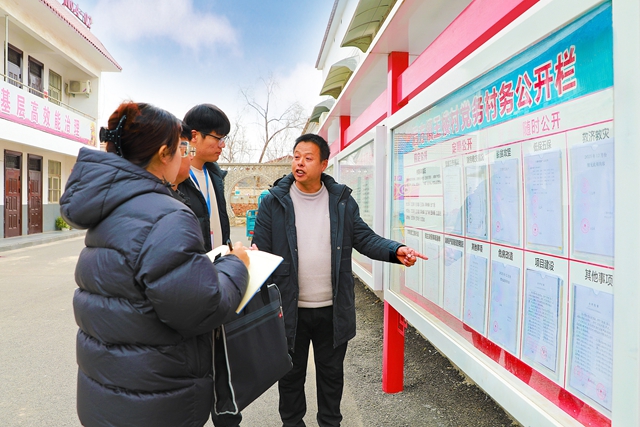 河南省濮阳市纪委监委推动加大农村集体“三资”公示公开力度,督促各村(社区)综合运用管理平台、村务公开栏等,及时公开“三资”管理使用情况。图为近日,该市台前县纪检监察干部在后方镇王楼村查看公开公示情况。张乐斌 摄