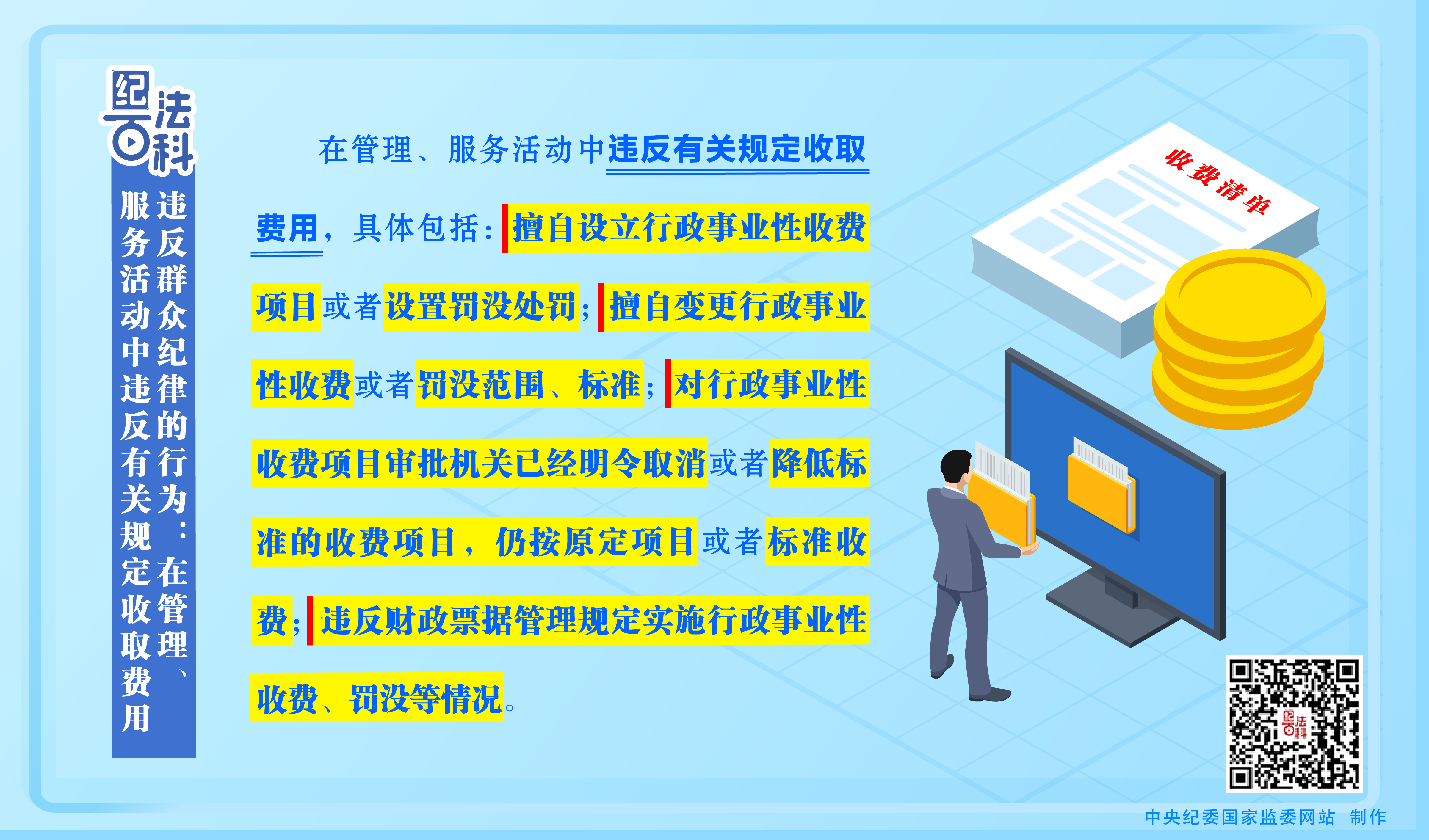 在管理、服务活动中违反有关规定收取费用,具体包括:擅自设立行政事业性收费项目或者设置罚没处罚;擅自变更行政事业性收费或者罚没范围、标准;对行政事业性收费项目审批机关已经明令取消或者降低标准的收费项目,仍按原定项目或者标准收费;违反财政票据管理规定实施行政事业性收费、罚没等情况。