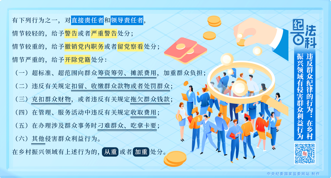 《中国共产党纪律处分条例》第一百二十二条、第一百二十三条对侵害群众利益行为列出负面清单,作出处分规定。第一百二十二条规定:有下列行为之一,对直接责任者和领导责任者,情节较轻的,给予警告或者严重警告处分;情节较重的,给予撤销党内职务或者留党察看处分;情节严重的,给予开除党籍处分: