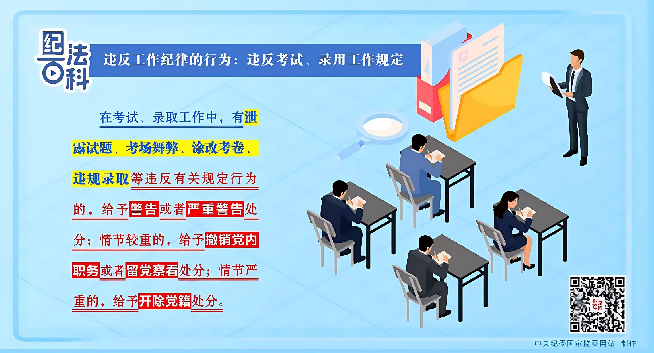 执纪监督中发现,有的将考试试题泄露给考生;有的与考生串通,在考试现场作弊;有的违反规定程序和条件,录用不符合条件的考生,或者使符合条件的考生不被录取等。承担考试、录取工作任务的党员、干部,必须提高思想认识,认真履行职责,严格遵守纪律规定,维护考试、录取工作良好秩序。