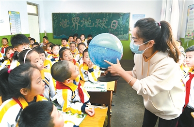 在第53个世界地球日到来之际,河北省新乐市相关部门联合当地小学开展“珍爱地球我们的家园”主题活动,科普地球知识。图为该市自然资源和规划局工作人员给小学生讲解有关知识。(图片来源:视觉中国)