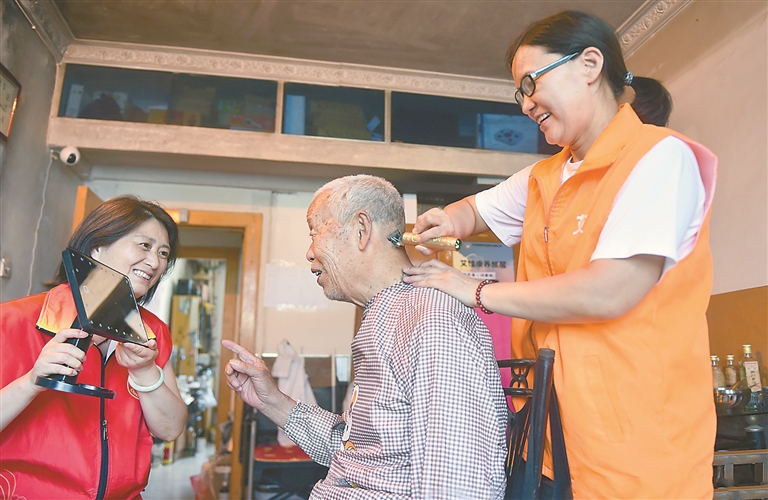近日,在河南省洛阳市涧西区武汉路街道秦岭路社区,养老服务中心护理员和社区志愿者为居家老人理发。 图片来源:视觉中国