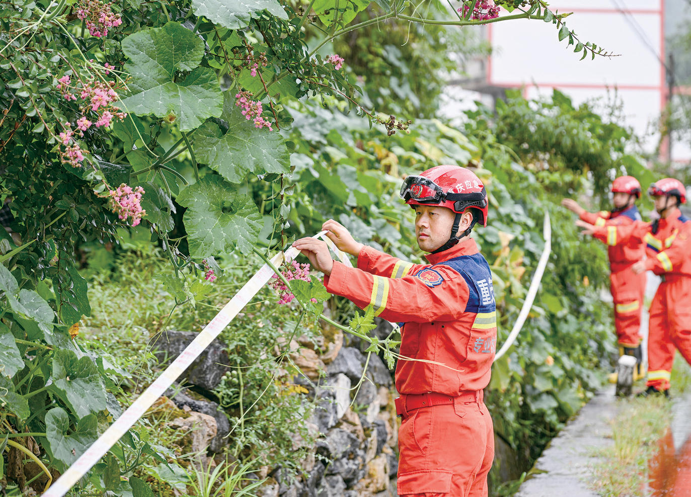 图为近日,抢险救灾人员在重庆市彭水苗族土家族自治县太原镇区阳村一处地灾风险点拉起警戒线。 新华社记者 王全超 摄