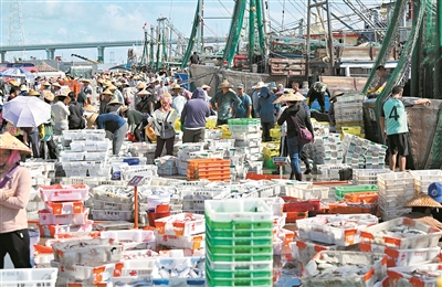 8月21日,海南省文昌市清澜渔港码头,渔民和商贩在卸货、交易。 新华社记者 郭程 摄