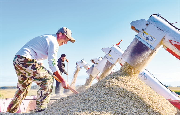 内蒙古自治区兴安盟扎赉特旗是“兴安盟大米”主要产区之一,近年来,当地深化与科研院所合作,聚焦高端专用水稻品种品质和种植技术提升,高标准建设水稻生产加工基地,延伸大米产业链条,实现水稻产业提质增效。图为近日,扎赉特旗69万亩水稻陆续成熟,稻农们利用晴好天气抢收稻谷。 图片来源:视觉中国