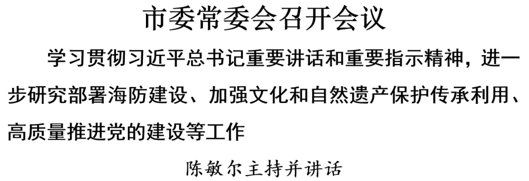 8月16日,市委常委会召开会议,学习贯彻习近平总书记在中央政治局第十六次集体学习时的重要讲话和对加强文化和自然遗产保护传承利用工作作出的重要指示精神,听取我市海防工作情况汇报,审议关于高质量推进党的建设、为奋力谱写中国式现代化天津篇章提供坚强保证的意见,研究部署有关工作。市委书记陈敏尔主持会议并讲话。