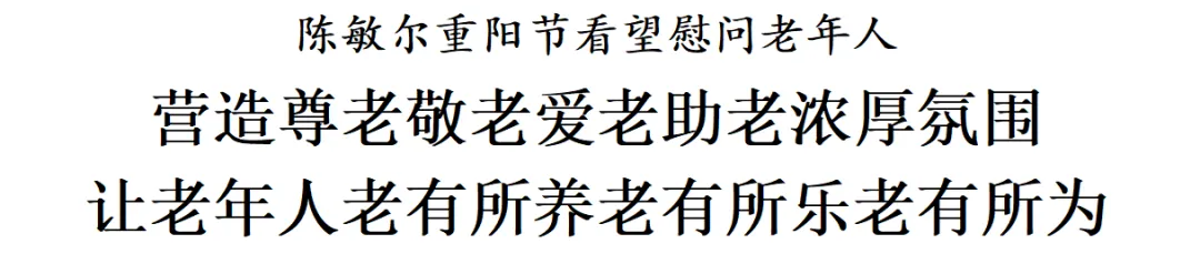 陈敏尔在调研中指出,老年人是党和国家的宝贵财富,尊老敬老是中华民族的传统美德。党的十八大以来,以习近平同志为核心的党中央高度重视老龄工作,精心谋划、统筹推进老龄事业发展。日前,习近平总书记专门回信勉励“银龄行动”老年志愿者代表,对做好老龄工作提出重要要求。各级各有关部门要深入贯彻落实习近平总书记关于老龄工作的重要指示精神,始终坚持以人民为中心的发展思想,把老年人生活保障好、作用发挥好、权益维护好,不断推动全市老龄事业高质量发展,切实把党中央对老年人的关心关怀落到实处。要健全老龄工作机制,完善党委领导、政府主导、社会参与、全民行动的老龄工作格局,营造尊老、敬老、爱老、助老的浓厚氛围。要聚焦老年人的急难愁盼问题,完善医养康养相结合的养老服务体系和健康支撑体系,优化居家养老、社区养老服务,建立健全专业、快捷、便利的养老服务平台,更好满足老年人就餐、出行、就医等多元化、个性化服务需求。希望广大老年朋友保持老骥伏枥、老当益壮的健康心态和进取精神,积极参与志愿服务,既要老有所养、老有所乐,又要老有所为,为谱写中国式现代化天津篇章贡献“银发力量”。