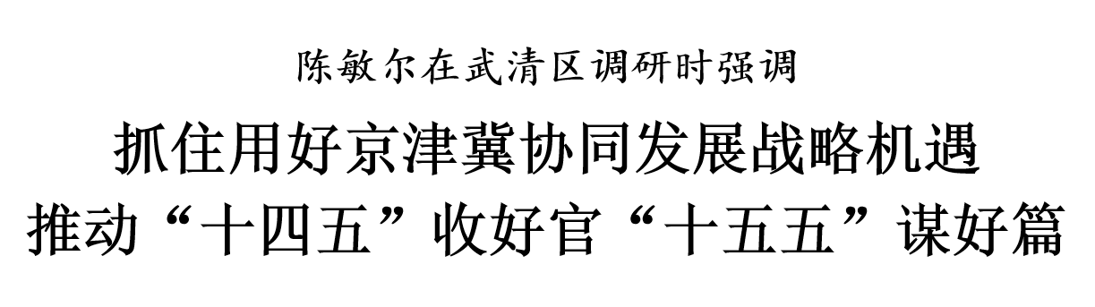 在武清京津产业新城投资促进会客厅,陈敏尔听取武清区做好当前经济工作和推进武清京津产业新城高质量发展等情况汇报。他说,武清区在落实京津冀协同发展战略中发挥着重要作用,面临着重要机遇,推动高质量发展方兴未艾、正逢其时。要深学深用习近平总书记视察天津重要讲话精神,以推进京津冀协同发展为战略牵引,找准方位定位,把握工作落点,唱好京津“双城记”,建强武清京津产业新城等平台载体,做好站产城融合、商文旅融合文章,推动教育科技人才一体化发展。要注重规划引领,统筹当前和长远,进一步完善空间、交通、产业规划,增强规划的科学性、战略性、可操作性,更好从全局谋划一域、以一域服务全局。要强化政策支撑,用足用好中央存量政策和一揽子增量政策,把市委、市政府支持武清京津产业新城高质量发展的政策措施落实落细落到位,充分释放政策的综合效应、叠加效应。要加强产业导入,突出产业链招商、以商招商,深化拓展与国企、民企、外企合作,引入更多有科技含量、就业容量、环境质量、税源增量的项目,加快形成新质生产力。要完善城区配套,优化生产、生活、生态空间布局,注重职住平衡,提升公共服务水平,推动交通便利化,营造近悦远来的良好环境。要坚持安全托底,更好统筹发展和安全,有效防范化解各类风险,深入排查化解矛盾纠纷,切实维护社会安全稳定,筑牢首都政治、安全“护城河”。