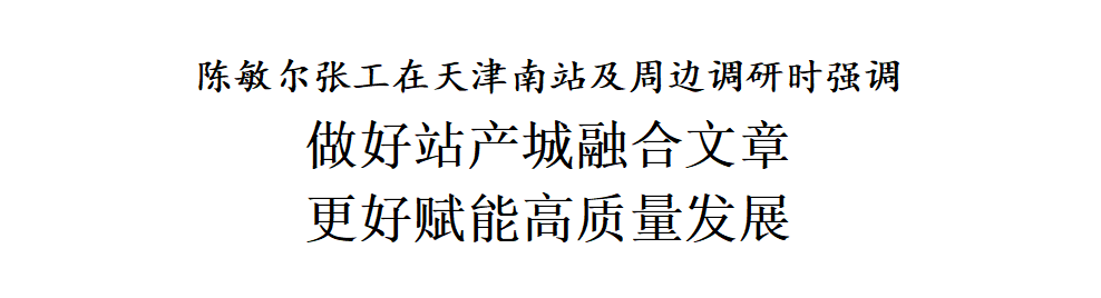 4月22日,市委书记陈敏尔,市委副书记、市长张工深入天津南站及周边商业综合体,调研站产城融合发展工作。陈敏尔强调,要深入学习贯彻习近平总书记视察天津重要讲话精神,以推进京津冀协同发展为战略牵引,充分发挥高铁站点综合交通枢纽优势和作用,做好站产城融合文章,盘活用好周边存量资源,积极实施城市更新行动,以站带产、以产兴城、以城聚人,更好赋能高质量发展。