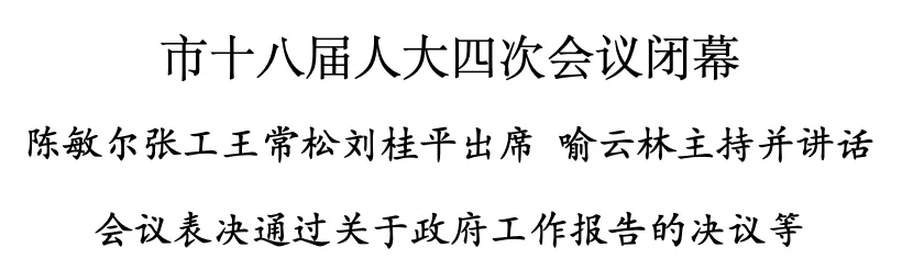 完成各项议程后,喻云林说,天津市第十八届人民代表大会第四次会议,在全体代表和与会同志的共同努力下,圆满完成了各项任务。会议期间,全体代表肩负全市人民重托,以饱满的政治热情和昂扬的精神状态依法履职尽责,会议成果充分体现了党的主张和人民意志的统一,充分彰显了人民代表大会制度的显著政治优势,是一次民主、团结、求实、奋进的大会。