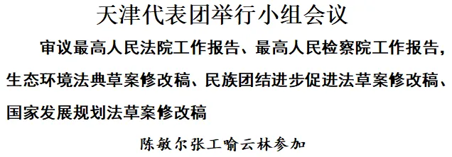 3月10日,十四届全国人大四次会议天津代表团举行小组会议,审议最高人民法院工作报告、最高人民检察院工作报告,生态环境法典草案修改稿、民族团结进步促进法草案修改稿、国家发展规划法草案修改稿。陈敏尔、张工、喻云林、段春华等代表参加。最高人民法院党组成员、副院长杨临萍,最高人民检察院党组成员、副检察长苗生明分别到会听取意见。
