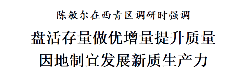 陈敏尔在调研中强调,要深入贯彻落实习近平总书记视察天津重要讲话精神和对天津工作一系列重要指示要求,善作善成做好“三新”、“三量”等重点工作,加快形成新质生产力,扎实推动高质量发展。在盘活存量上下功夫,坚持有效市场和有为政府相结合,抓实存量资源资产盘活利用,注重法治化推进、市场化运作、产业化导入,因地制宜探索盘活方式,有针对性地招商引资,形成更多新就业、新税收、新增加值,实现有效益、可持续运营,做到盘而活、盘而兴。推动科技创新和产业创新深度融合,主动融入现代化首都都市圈,用好北京(京津冀)国际科技创新中心扩围的机遇,高标准建设天开西青园等科创园区,完善科技服务体系,促进更多科创成果转化落地,优化提升传统产业、培育壮大新兴产业、超前布局未来产业,推进优势产业成龙配套、成链成群。坚持以文塑旅、以旅彰文,深入发掘历史文化资源,积极探索民俗文化创新发展的有效路径,拓展“文旅+商贸”、“文旅+演艺”等新场景,打造具有鲜明特色和深刻内涵的文化品牌,推动文旅商体展、农文旅融合发展,更好统筹升级商品消费、扩大服务消费,不断培育新的增长点。加强党的领导和党的建设,以中央巡视反馈意见整改为契机,持之以恒推进全面从严治党,扎实开展树立和践行正确政绩观学习教育,引导广大党员、干部为人民出政绩、以实干出政绩,为奋力谱写中国式现代化天津篇章贡献力量。
