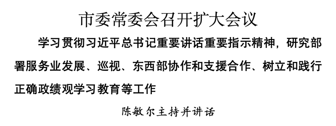 4月9日,市委常委会召开扩大会议,学习贯彻习近平总书记就服务业发展作出的重要指示、在参加首都义务植树活动时的重要讲话精神和全国服务业大会、全国巡视工作会议暨二十届中央第七轮巡视动员部署会精神,听取我市东西部协作和支援合作工作情况汇报,部署派出树立和践行正确政绩观学习教育市委督导组等工作。市委书记陈敏尔主持会议并讲话。