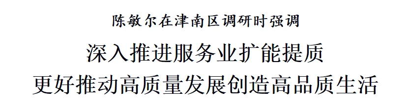 4月13日,市委书记陈敏尔前往津南区调研。他强调,要全面贯彻习近平总书记就服务业发展作出的重要指示和视察天津重要讲话精神,认真落实全国服务业大会精神,以推进京津冀协同发展为战略牵引,坚持扩能和提质并举,聚焦生产和生活需要,促进服务业优质高效发展,加快形成新质生产力,更好推动高质量发展、创造高品质生活。