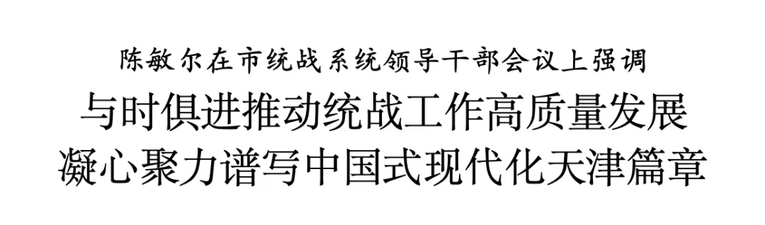 陈敏尔指出,党的十八大以来,习近平总书记就加强和改进统战工作提出了一系列新理念新思想新战略,形成了习近平总书记关于做好新时代党的统一战线工作的重要思想。今年是中国共产党成立105周年、“十五五”开局之年,做好统战工作意义重要。全市统战系统要完整、准确、全面贯彻落实习近平总书记关于做好新时代党的统一战线工作的重要思想,与学习贯彻习近平总书记视察天津重要讲话精神结合起来,围绕中心、服务大局、真抓实干,更好凝聚人心、凝聚共识、凝聚智慧、凝聚力量,努力实现“十五五”良好开局、奋力谱写中国式现代化天津篇章。