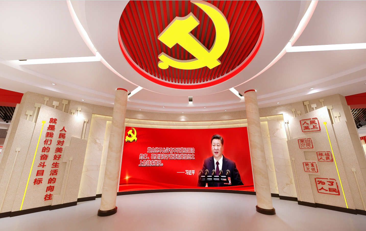 序厅由党徽照耀、习近平总书记重要讲话、党的宗旨理念组成。体现在中国共产党的正确领导下,在以习近平同志为核心的党中央集中统一领导下,坚持以人民为中心的发展思想,把“人民对美好生活的向往作为我们的奋斗目标”,教育引导全体党员干部尊崇党纪国法、传承纪律基因、坚持执纪为民、严肃党规党纪,以铁的纪律团结带领全党、全国各族人民为实现中华民族伟大复兴中国梦而不懈奋斗的主题思想!