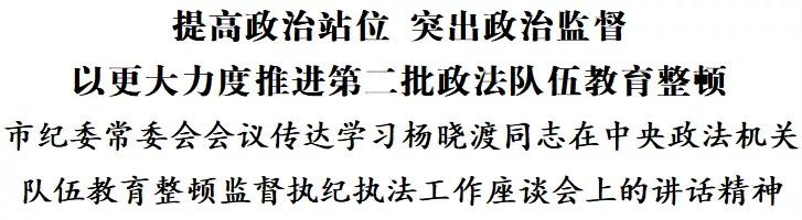 会议指出,要深入贯彻习近平总书记关于政法队伍教育整顿的重要指示批示精神,把思想和行动统一到党中央决策部署上来,切实增强政治执行力,立足职能职责,充分发挥监督保障执行、促进完善发展作用,坚决贯彻落实党中央、中央纪委国家监委和市委部署要求,以更大力度推进第二批政法队伍教育整顿。