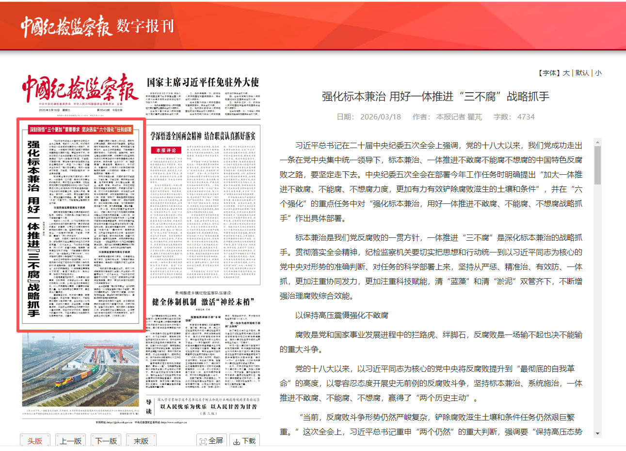 全会工作报告将“以深化廉洁教育强化不想腐”作为一体推进“三不腐”的重要内容,要求深入落实新时代廉洁文化建设三年行动计划,提升廉洁宣传教育的针对性有效性,不断塑造清正廉洁的思想品格、廉洁奉公的政德修养、廉洁自律的道德操守、崇廉拒腐的社会风尚,为持续厚植廉洁文化土壤、筑牢拒腐防变思想防线提供抓手。