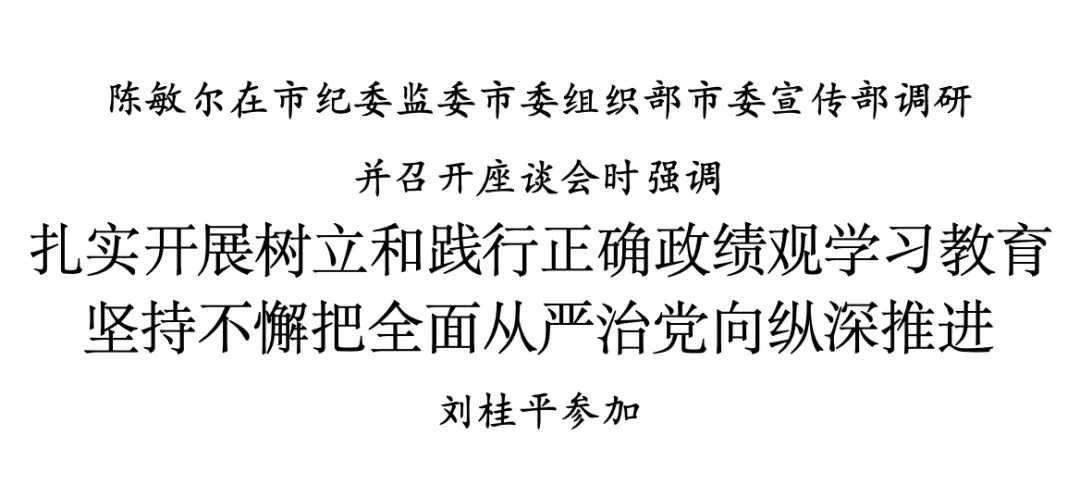 陈敏尔强调,开展树立和践行正确政绩观学习教育,是今年党的建设的重要任务。纪检监察、组织、宣传部门肩负着抓好自身学习教育和服务市委抓好全市学习教育的“双重责任”。要深入学习贯彻习近平总书记关于树立和践行正确政绩观的重要论述,全面落实“立党为公、为民造福、科学决策、真抓实干”总要求,抓好学习研讨,突出问题导向,注重常态长效,加强指导督导,教育引导各级党组织和党员、干部在深学、真查、实改上下功夫,深刻汲取正反面典型案例经验教训,对照中央要求精准查摆政绩观偏差主要问题,做到边查边改、立行立改,切实把学习成效转化为强化党性锻炼的高度自觉,转化为为人民出政绩、以实干出政绩的实际行动。